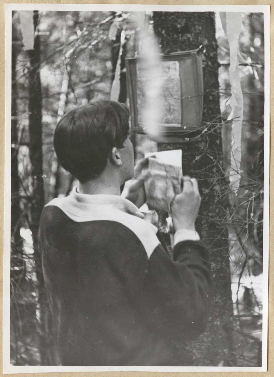 Titel: Man står med karta framför en orienteringsskylt upphängd i ett träd i skogen.