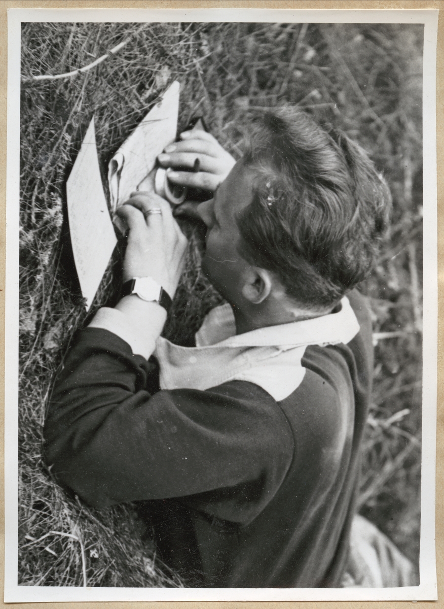 Titel: En man ligger i gräset på mage och läser av en karta med hjälp av en kompass.