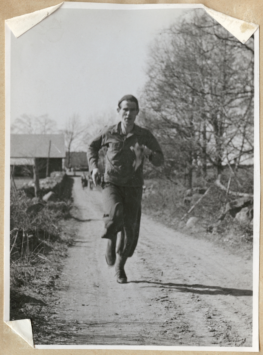 En man kommer springande på en rak grusväg som kantas av stenar och träd. I ena handen har han en karta. En bit bort i bakgrunden skymtas fler personer på grusvägen.