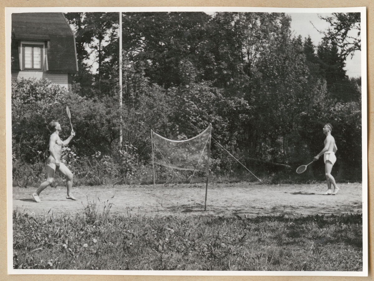 Två män iförda badbyxor spelar badminton på en sandplan. Runtom finns grönska och till vänster i bild skymtar ett hus.