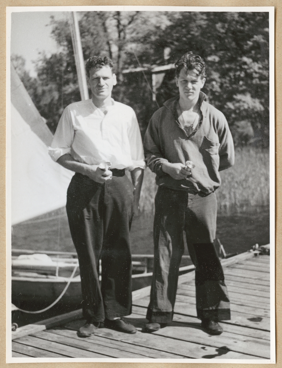 Två ledigt klädda män står på en brygga. Båda håller i två mindre pokaler. Bakom dem syns en jolle med segel ligga förtöjd, och längre bak syns grönska och taket på en mindre byggnad.