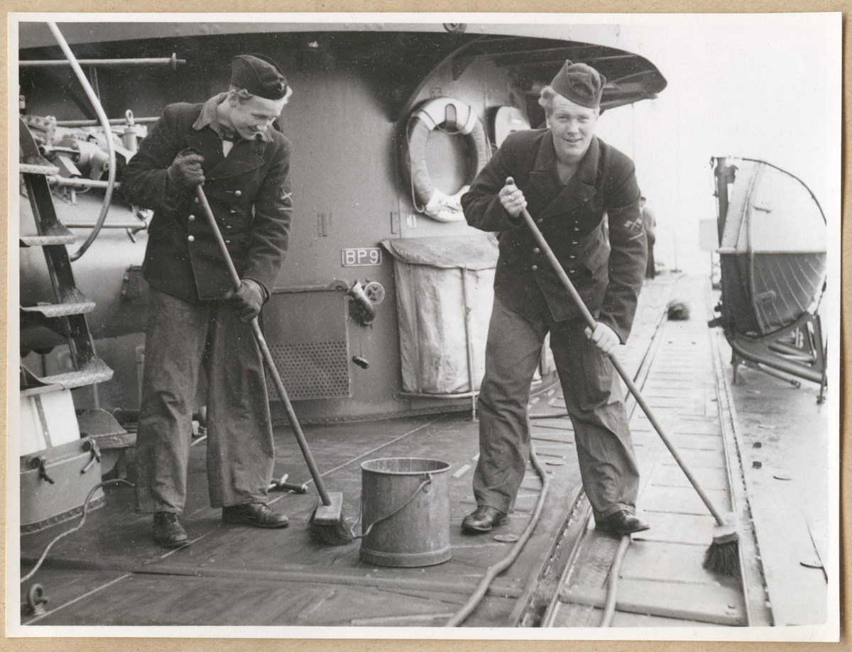 Två unga matroser står med sopborstar och sopar däcket på ett fartyg. De bär uniformer. Den ena ser in i kameran och ler. I bakgrunden syns en mindre båt ombord på däck, troligtvis en av fartygets livbåtar.