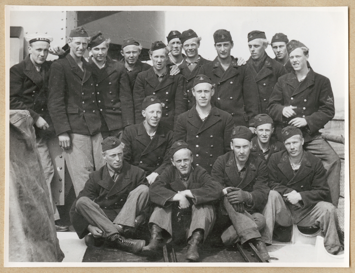 Titel: Unga uniformsklädda sjömän står uppställda inför ett gruppfoto ombord på ett fartyg.