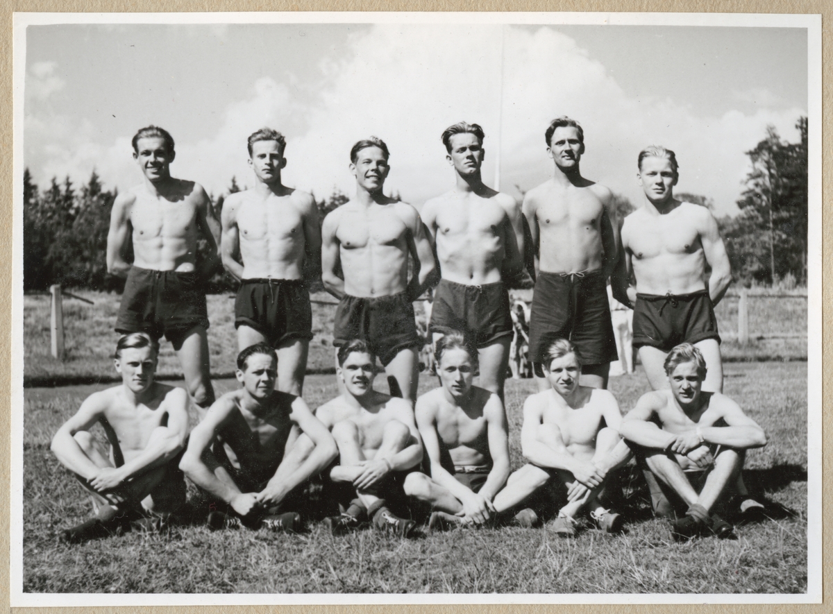 Unga barbröstade män iförda shorts har samlats på en gräsyta för att ta en gruppbild. Den främre raden sitter ned på marken medan den bakre raden står upp.