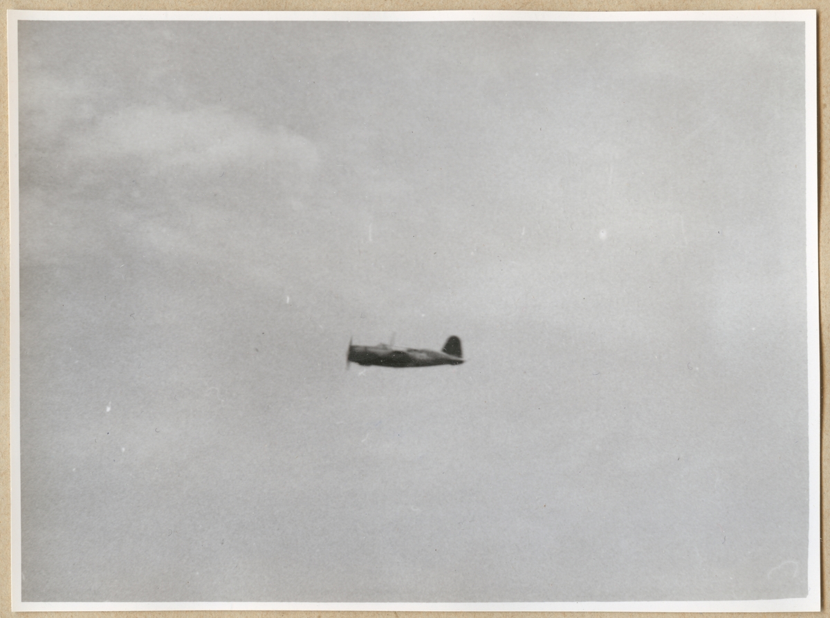 Titel: Ett propellerflygplan under färd i luften.