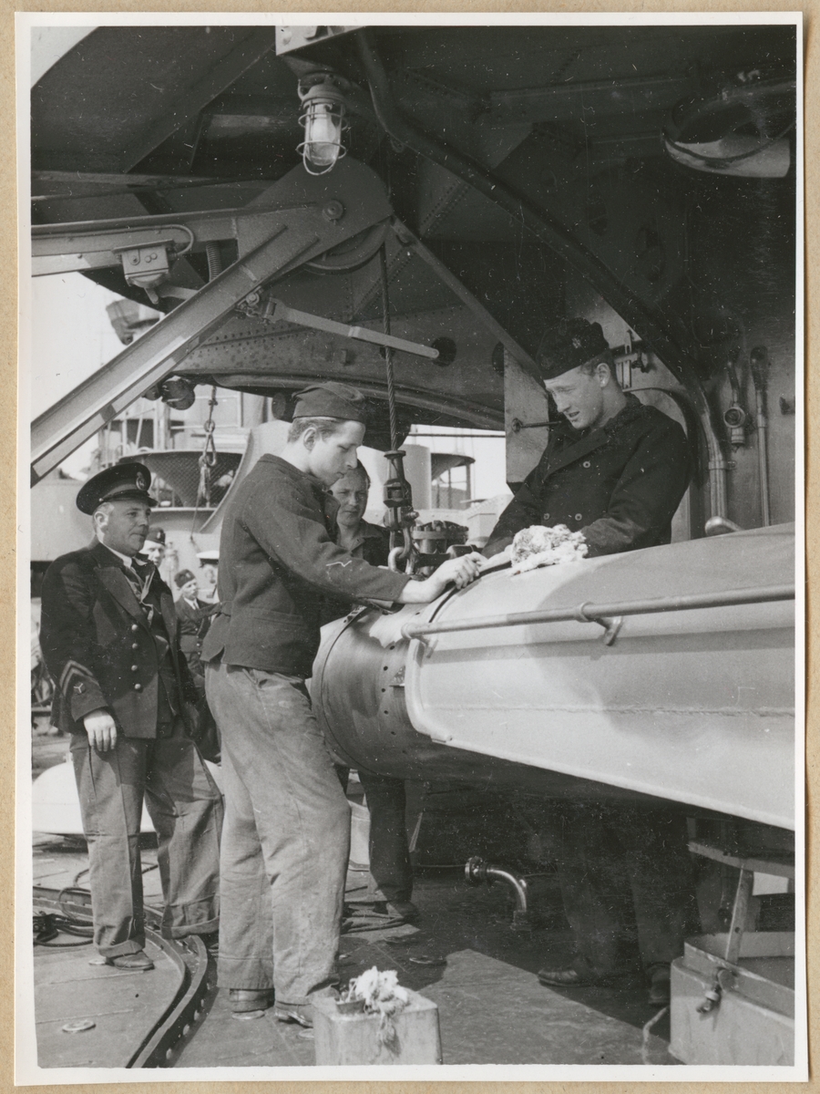 Uniformsklädda militärer i arbete med en torped ombord på ett fartyg. I bakgrunden syns en torpedmästare observera arbetet.