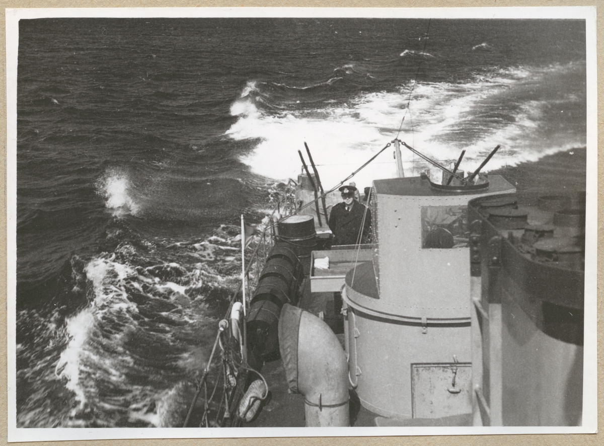 Akterdelen på ett fartyg, tagen från fartygets mittdel. Fartyget är på färd genom vattnet. I bild syns även en kapten ståendes på däck.