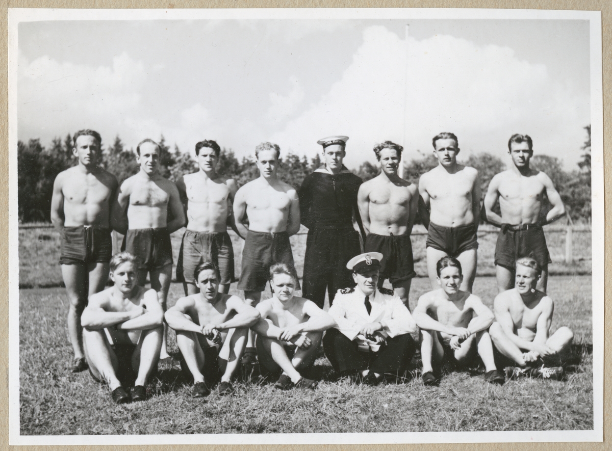 Unga barbröstade män iförda shorts har samlats på en gräsyta för att ta en gruppbild. Den främre raden sitter ned på marken medan den bakre raden står upp.