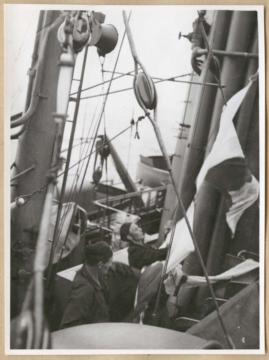 Titel: Två sjömän arbetar ombord på ett fartyg.