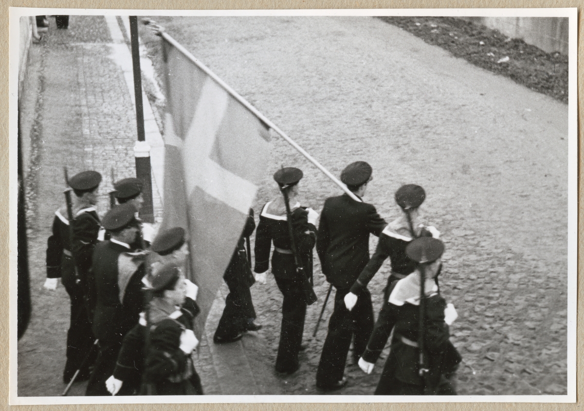 Flottister paraderar ut på gatan i uniformer, med vapen på ryggarna. Den främre av dem bär upp en stor, tretungad Sverigeflagga.