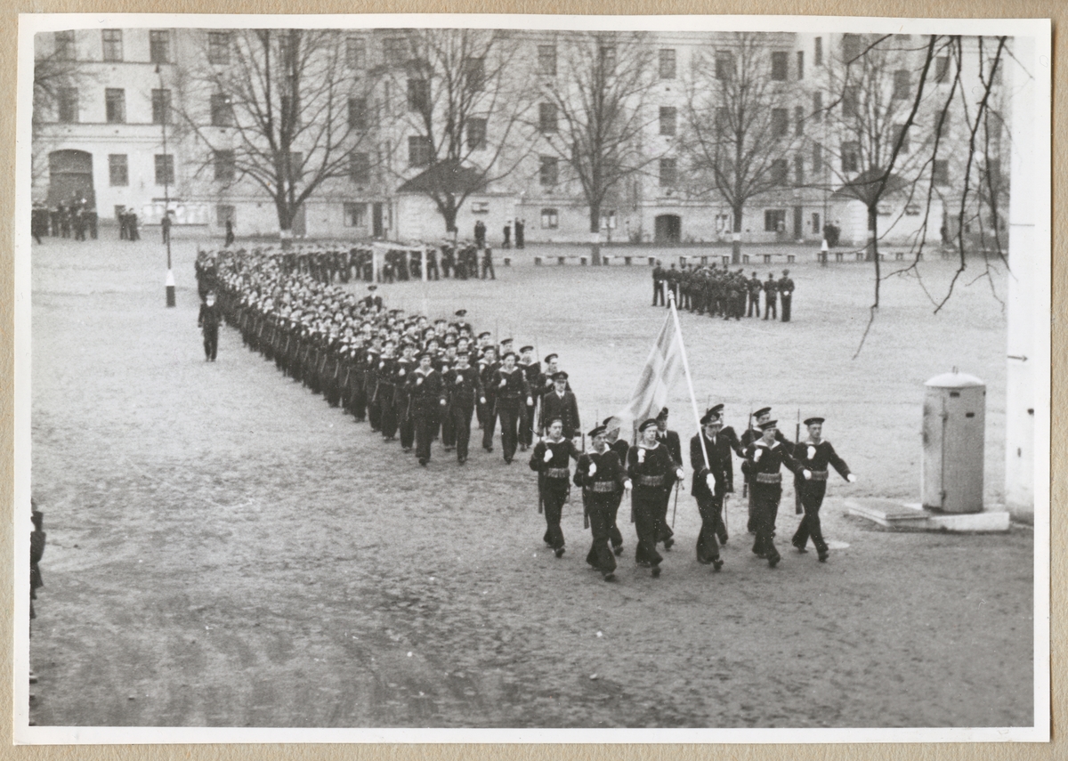 Flottister går i en paradmarsch genom gården på Bataljon Sparre. En i den främre gruppen håller upp en stor Sverigeflagga. I bakgrunden syns en av byggnaderna på Sparre.