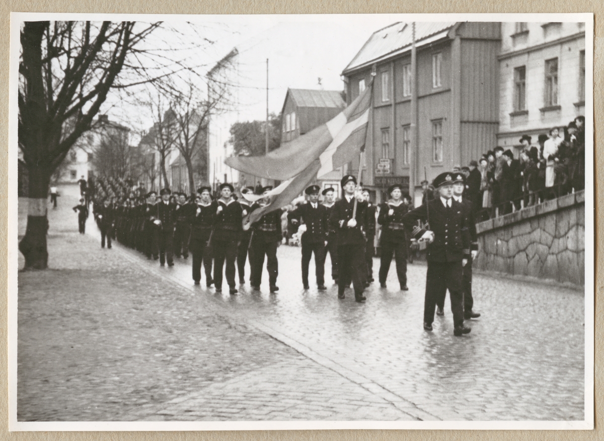 Flottister paraderar längs Drottninggatan i Karlskrona. I bakgrunden syns civila människor stå vid sidan av och se på. En av de främre befälen håller upp en tretungad, stor Sverigeflagga.