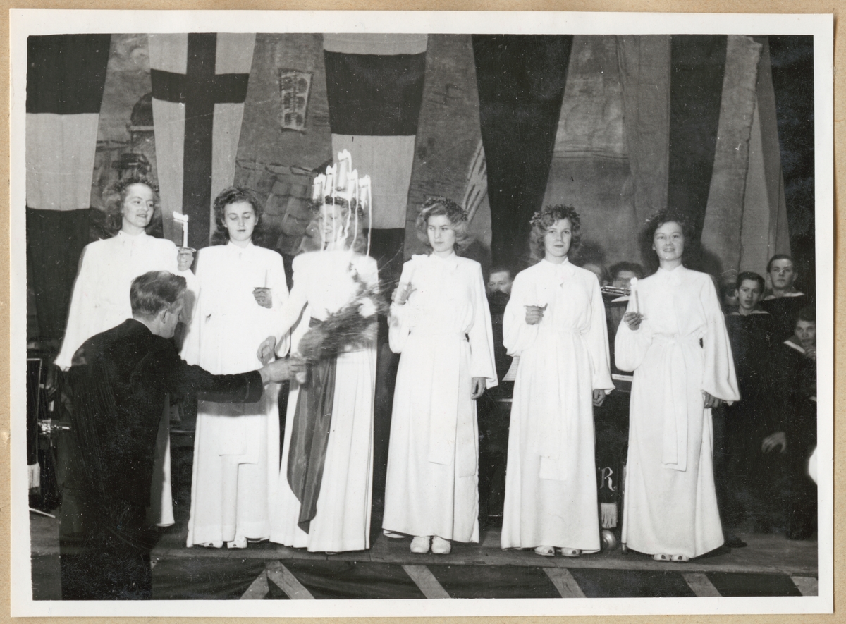 En Lucia står med fem tärnor på ett podium. I bakgrunden syns unga värnpliktiga inom flottan samt olika flaggor. En man står framför lucian och tärnorna och räcker fram en bukett.