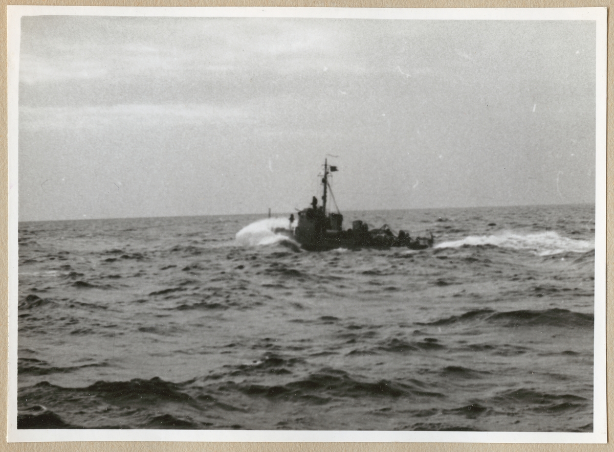 Titel: Örlogsfartyg under färd bland skvalpande vågor.