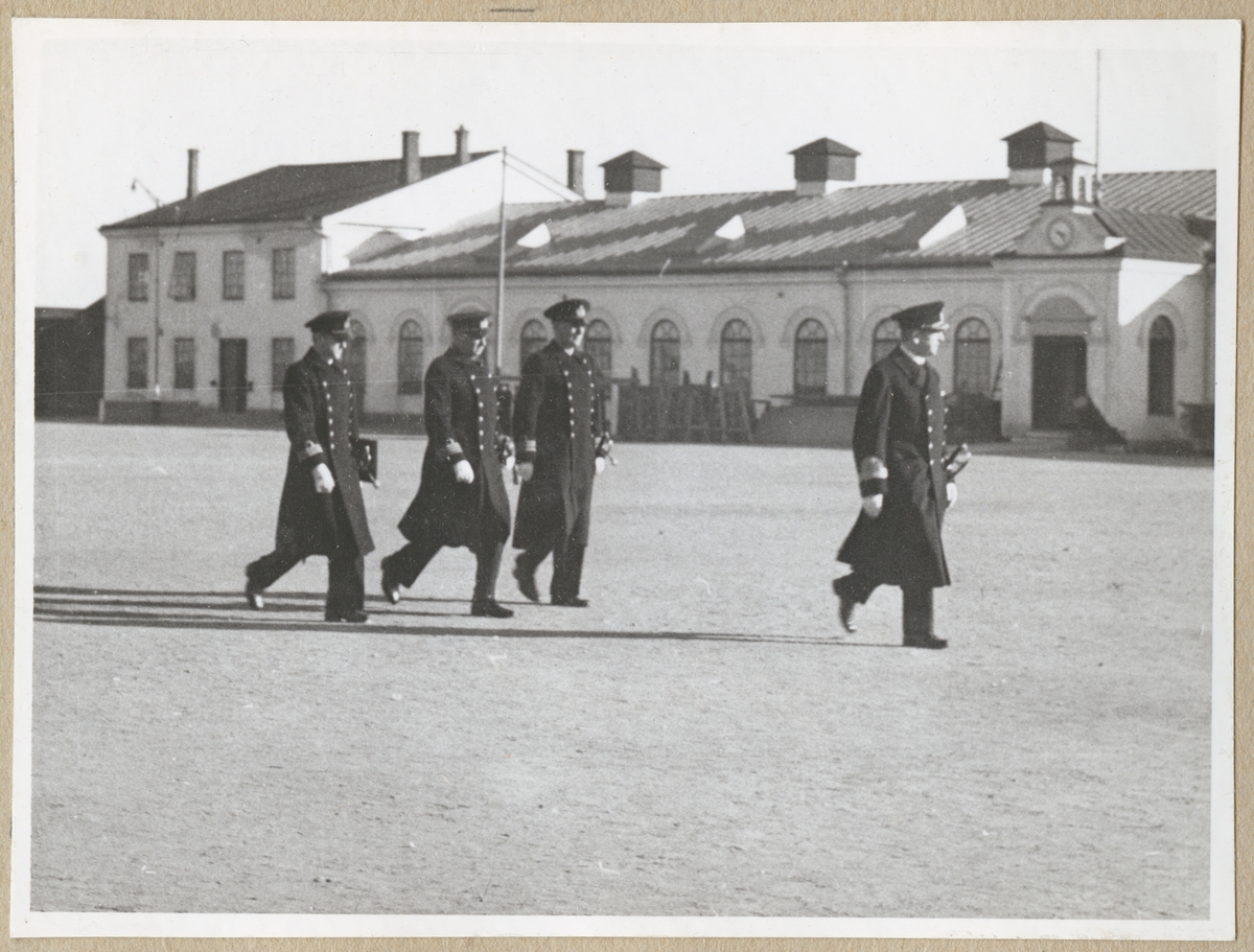 En konteramiral och tre kommendörkaptener går över Sparres kaserngård. I bakgrunden syns bataljonens excercishus.