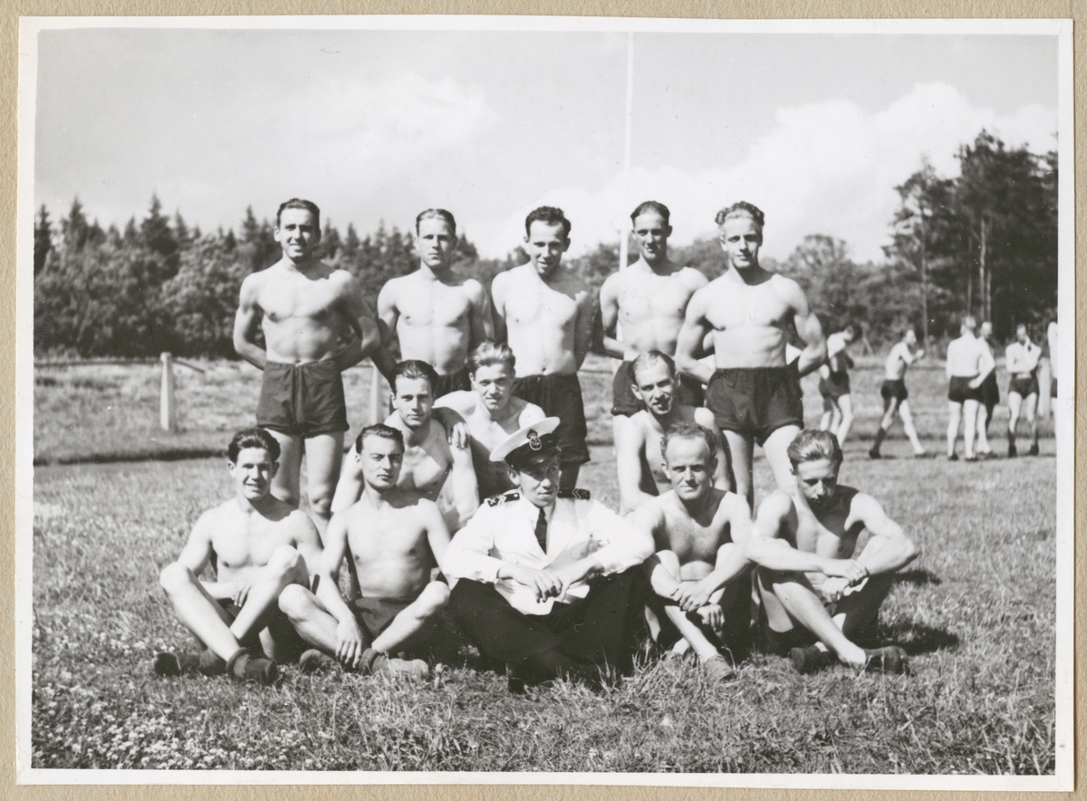 Barbröstade unga män, iförda shorts, har samlats på en gräsyta för att ta en gruppbild. Den främre raden sitter ned på marken medan den mittersta raden sitter på huk och den bakre raden står upp. I mitten i den främre raden sitter en uniformsklädd militär.
