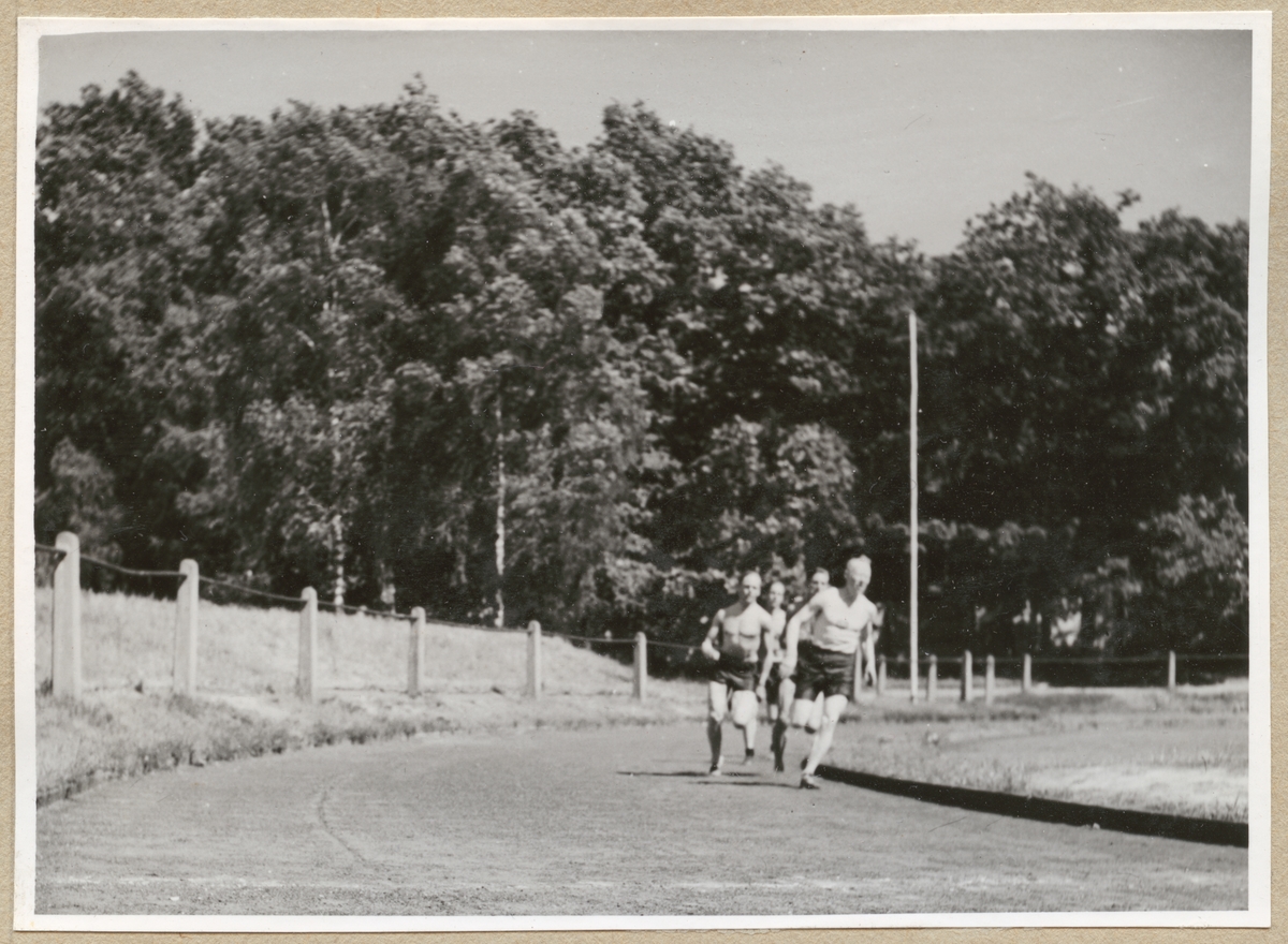 Titel: En grupp män i träningsshorts löper på en rundad bana. I bakgrunden syns träd.
