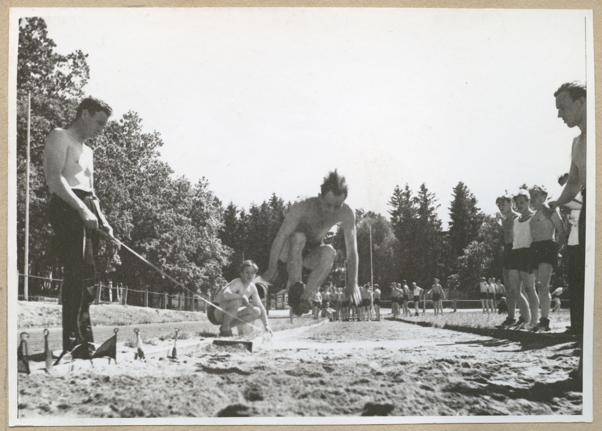 En ung barbröstad man fångad på bild under ett längdhopp. Runt omkring längdhoppsgropen står flera unga män och tittar på.