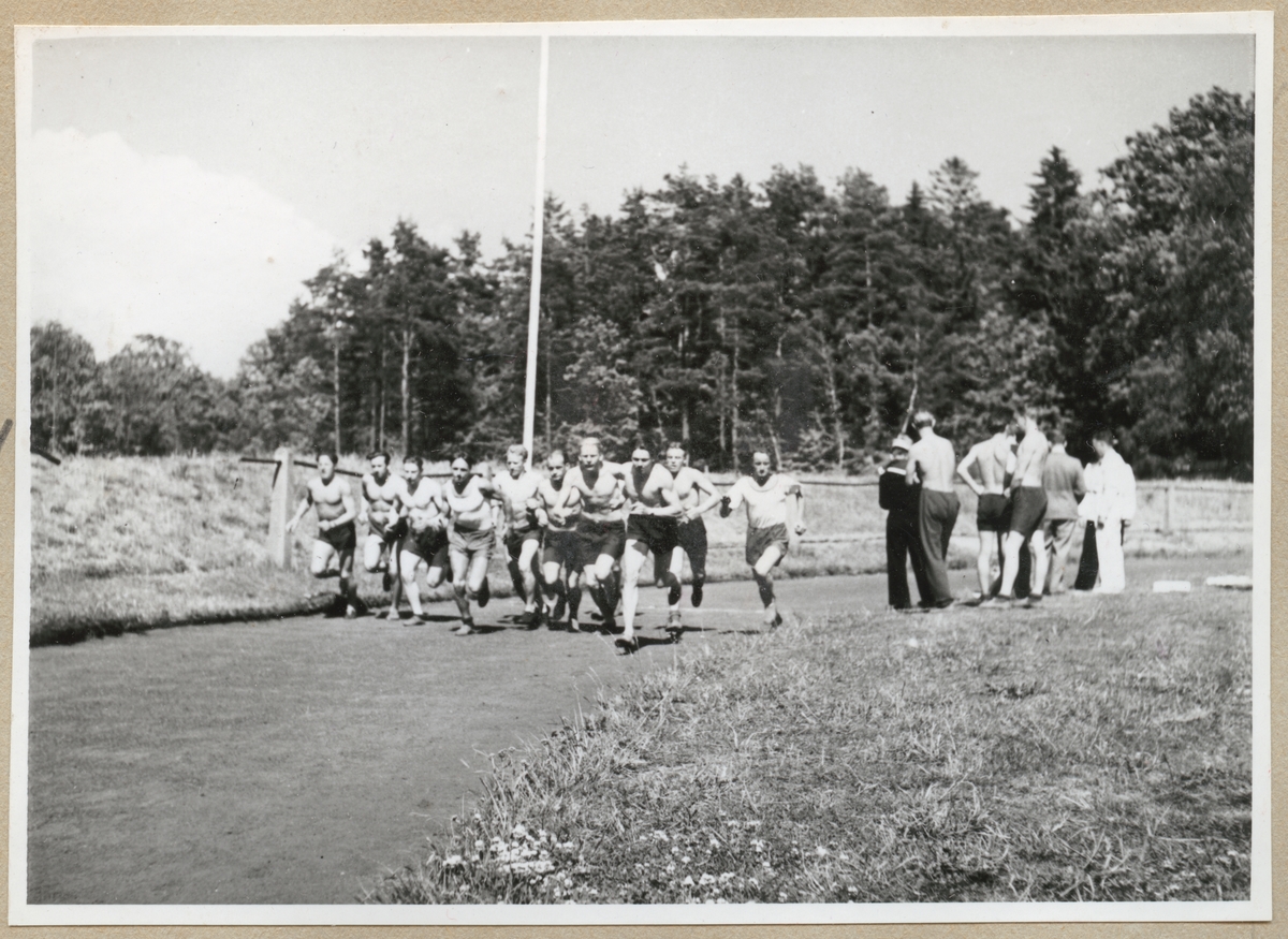 En grupp idrottsmän tävlar i löpning mot varandra längs en motionsbana. Vid sidan av står en grupp människor och ser på. I bakgrunden syns en skog.