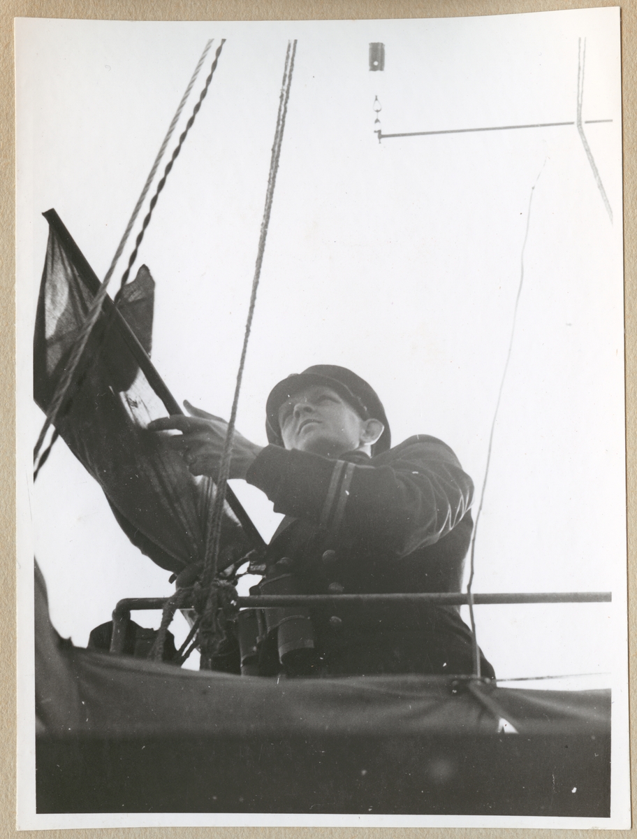Titel: En löjtnant håller i vad som ser ut som en flagga ombord på ett fartyg.