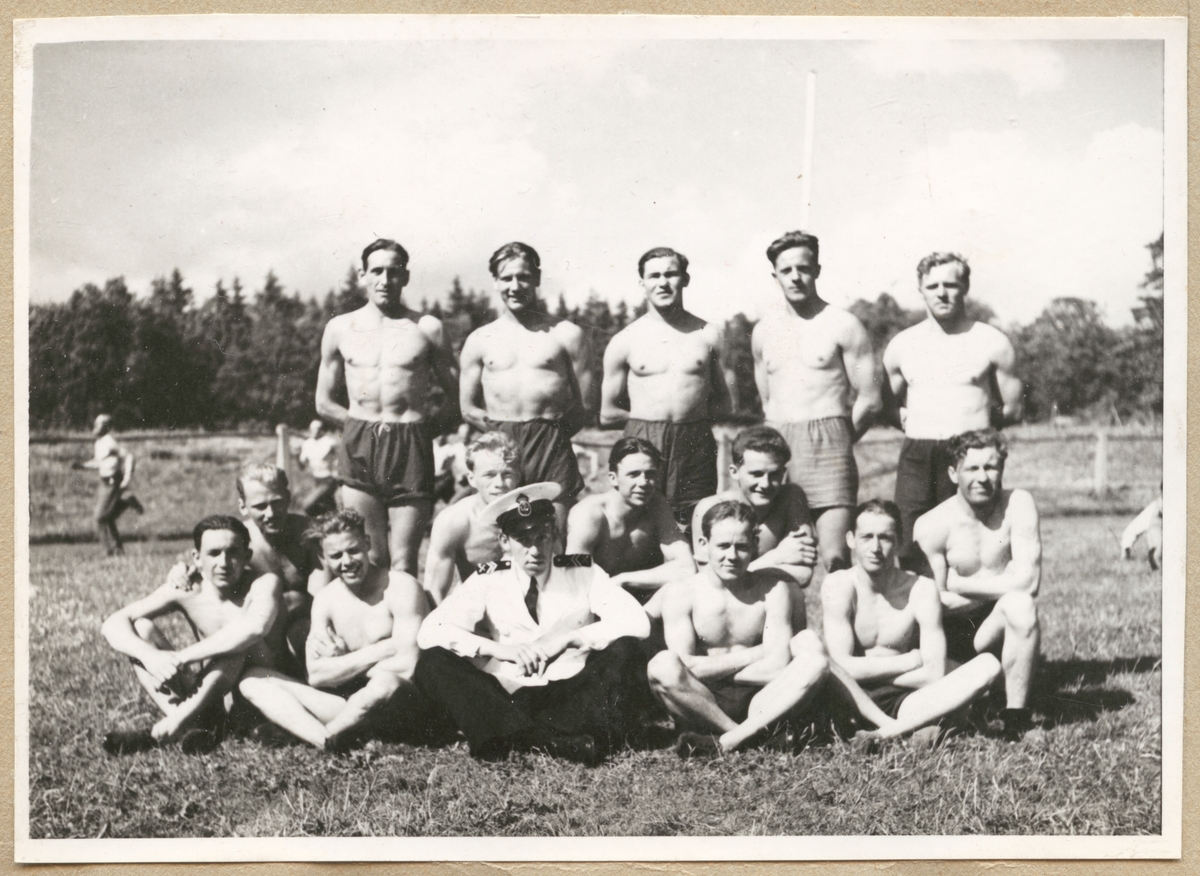En gruppbild på unga idrottande män iförda endast shorts och skor. Gruppen står i tre rader: Den främsta sitter i skräddarställning, den mellersta står på ett knä och den bakre står upp. I den främsta raden sitter även en uniformsklädd militär.