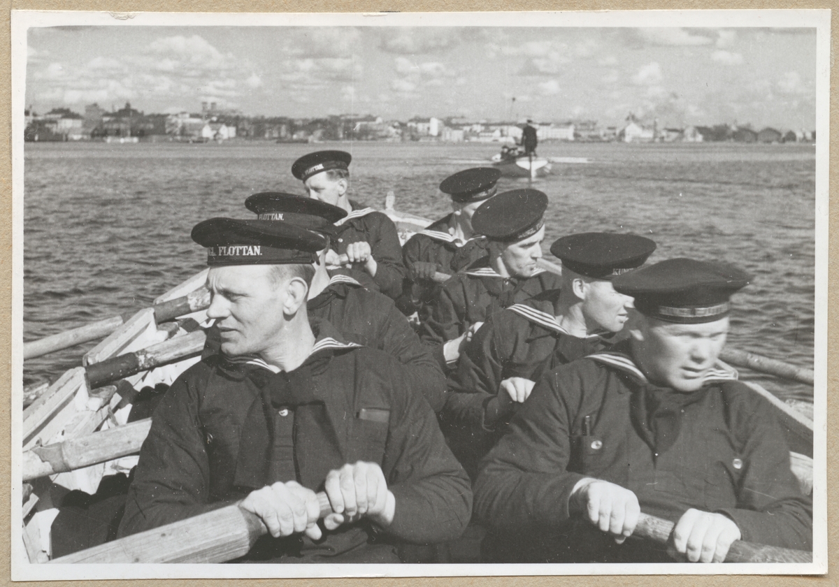 Uniformsklädda flottister sitter i en roddbåt och ror. Lite längre fram syns ytterligare en roddbåt. I bakgrunden syns Karlskronas stadssilhuett.