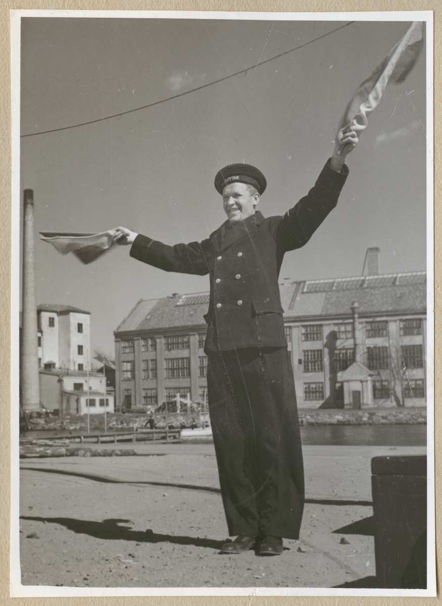En uniformsklädd flottist ler och vifftar med två flaggor. I bakgrunden syns beklädnadsverkstaden på Stumholmen.
