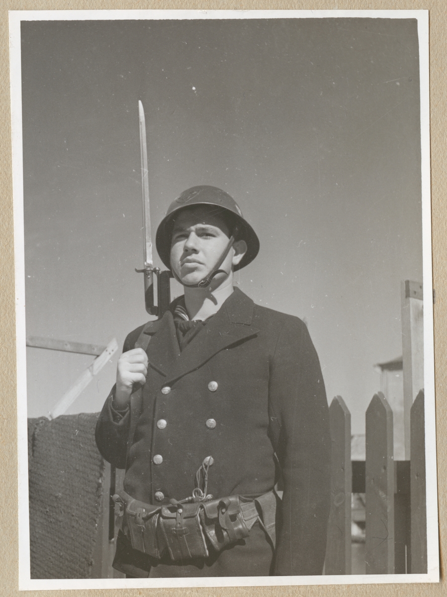 En militär i uniform och hjälm poserar framför kameran. På ryggen bär han ett vapen med bajonettklinga som sticker upp. Bakom honom syns ett enkelt staket.