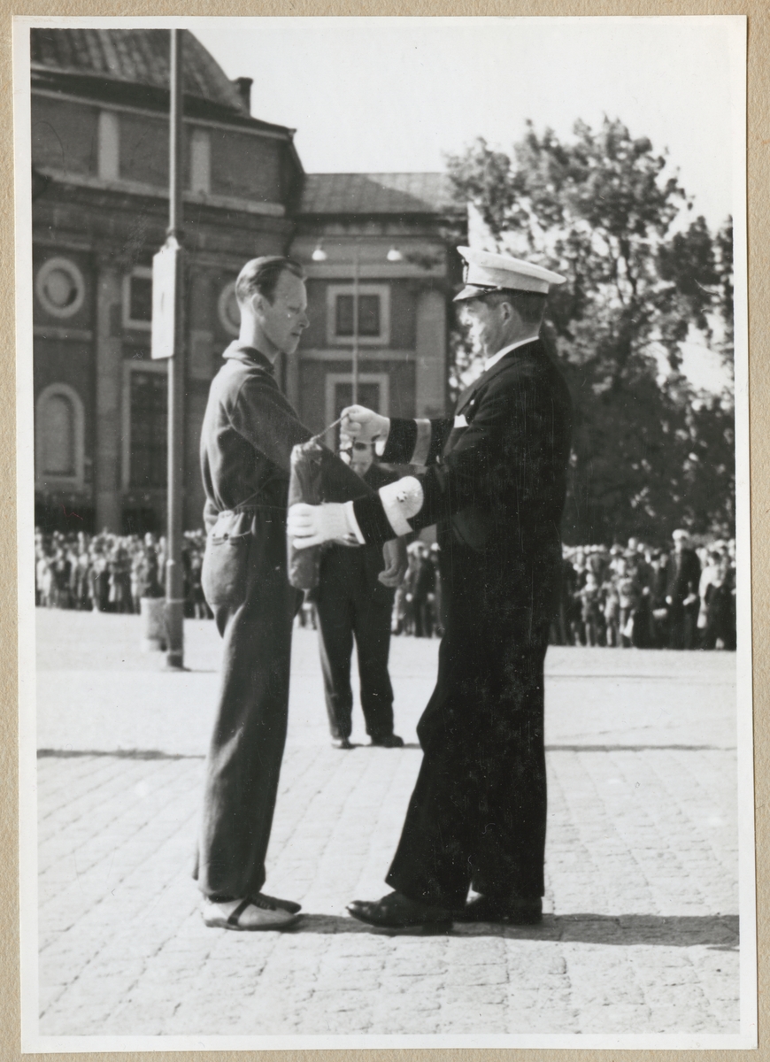 Konteramiral Ehrensvärd lägger om något över en ledigt klädd mans arm. De står på stortorget. I bakgrunden skymtar en folkmassa och västra sidan av Trefaldighetskyrkan.