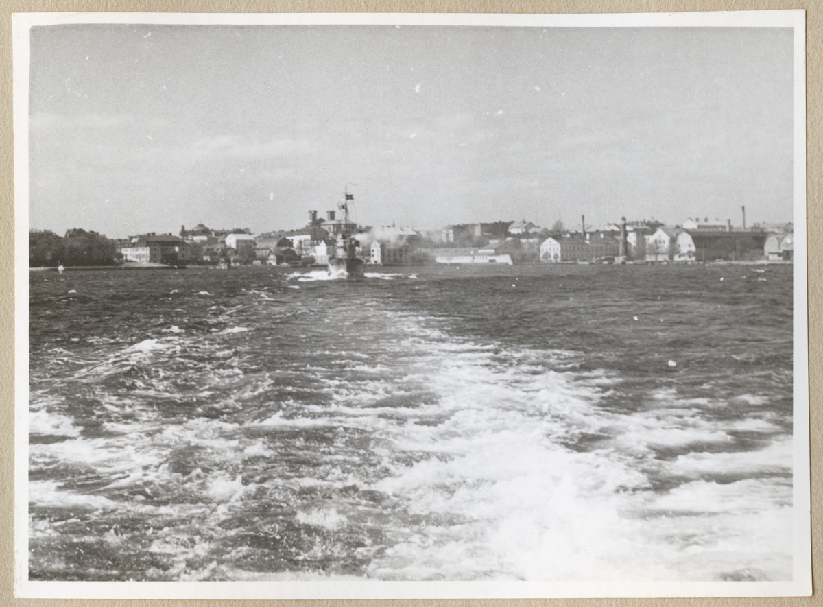 Ett fartyg är på väg i full fart ut från Trossö. Man ser fören, då det följer efter fartyget som bilden är tagen ifrån. I bakgrunden syns Karlskrona stads östra delar, söder om stumholmen, som syns till höger i bild.