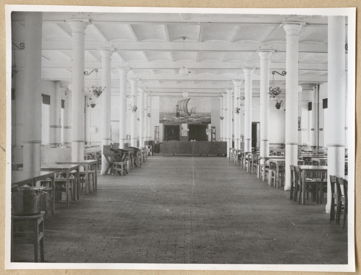 Interiören i matsalen på Bataljon Sparre. Sidoskeppen är indelade med doriska kolonner. Längst bort mot väggen, ovanför två dörrpar finns en målning på väggen föreställande vikingaskepp till havs. Rummet är inrett med stolar och bord. Golvet är täckt med tegelsten.