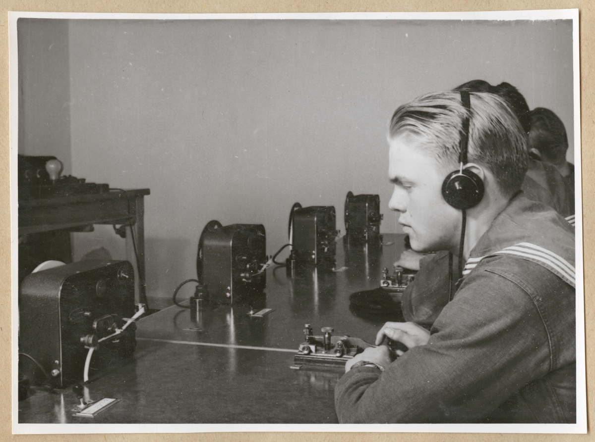 Titel: Flottister i uniform sitter ned vid telegrafer och lyssnar i hörlurar.