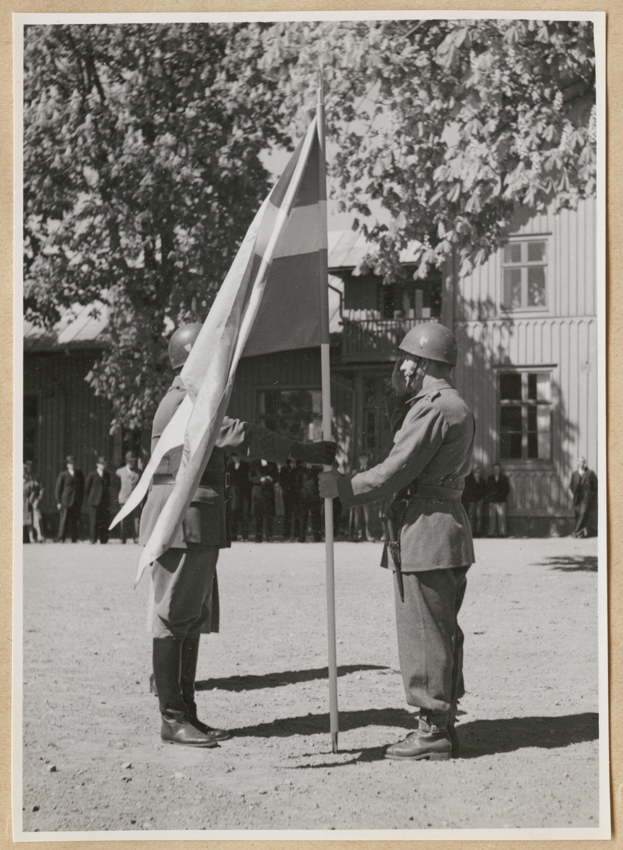 Två uniformsklädda militärer med hjälmar står på en grusgård och håller i en svensk flagga. I bakgrunden syns en träbyggnad och civila åskådare samt grönskande träd.