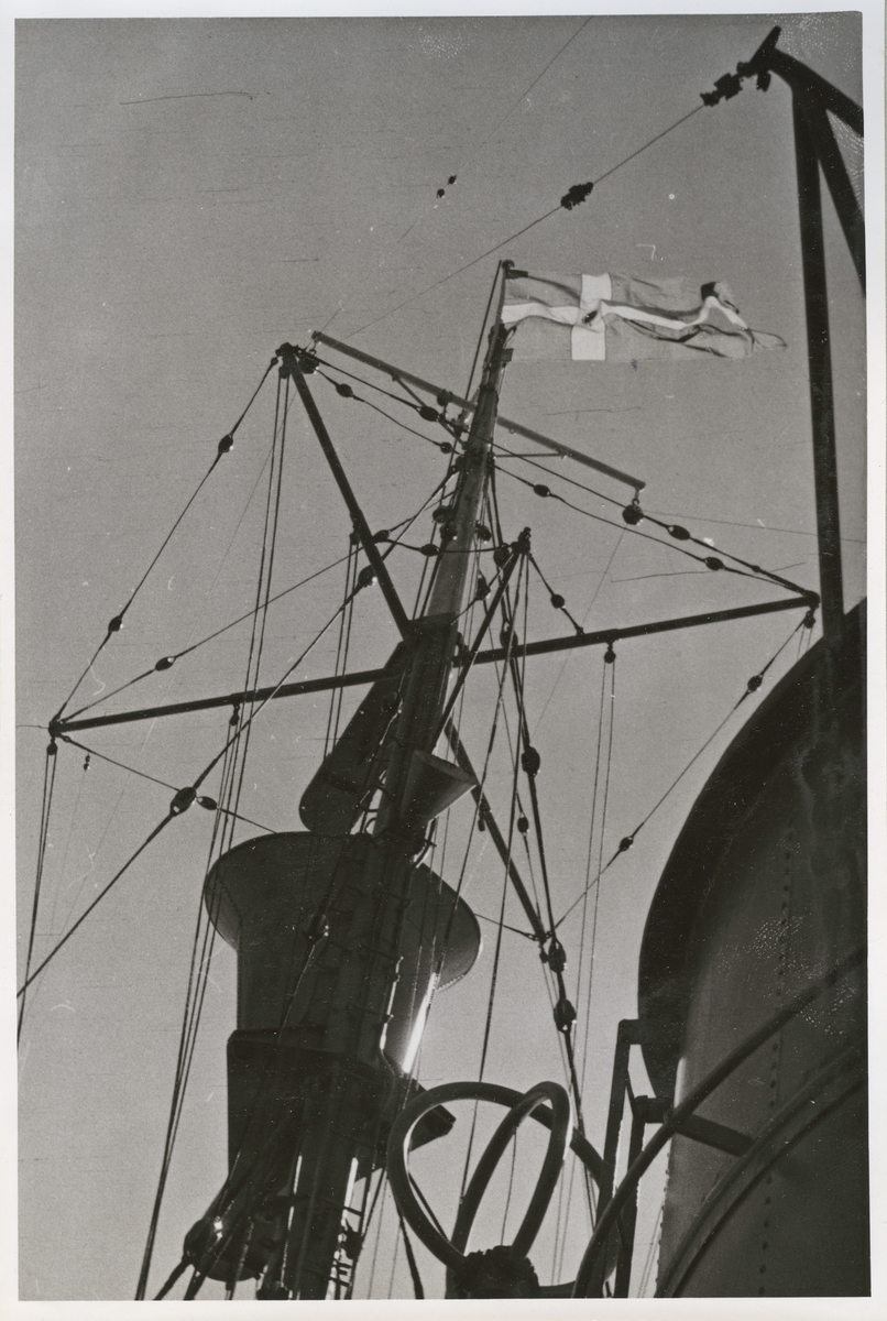 Titel: Fartygsmast med en svensk flagga i toppen.