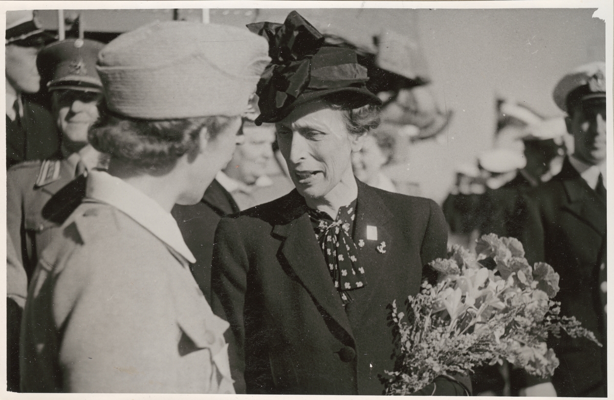 Drottning Louise, klädd i mörk dräkt och hatt samt med en blombukett i famnen, samtalar med en uniformsklädd lotta. I bakgrunden står ytterligare uniformsklädda militärer och lottor.