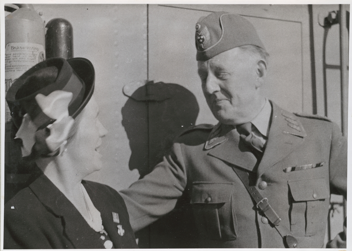 En militär och en lotta står och konverserar. I bakgrunden syns en vägg i plåt, möjligtvis på en båt.