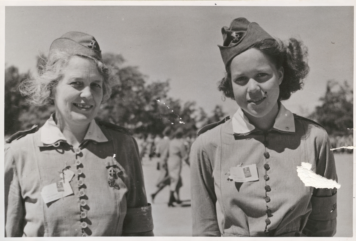 Två lottor poserar framför kameran, iklädda i uniformer och mössor. I bakgrunden syns fler uniformsklädda människor och grönska.