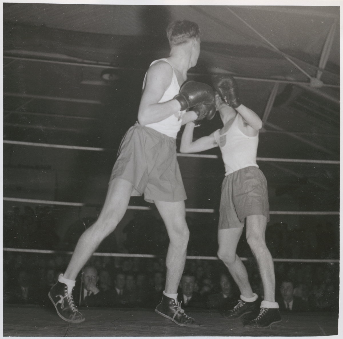 Titel: Två män iförda i sportkläder står i en boxningsring och boxas. Utanför ringen syns åskådare.