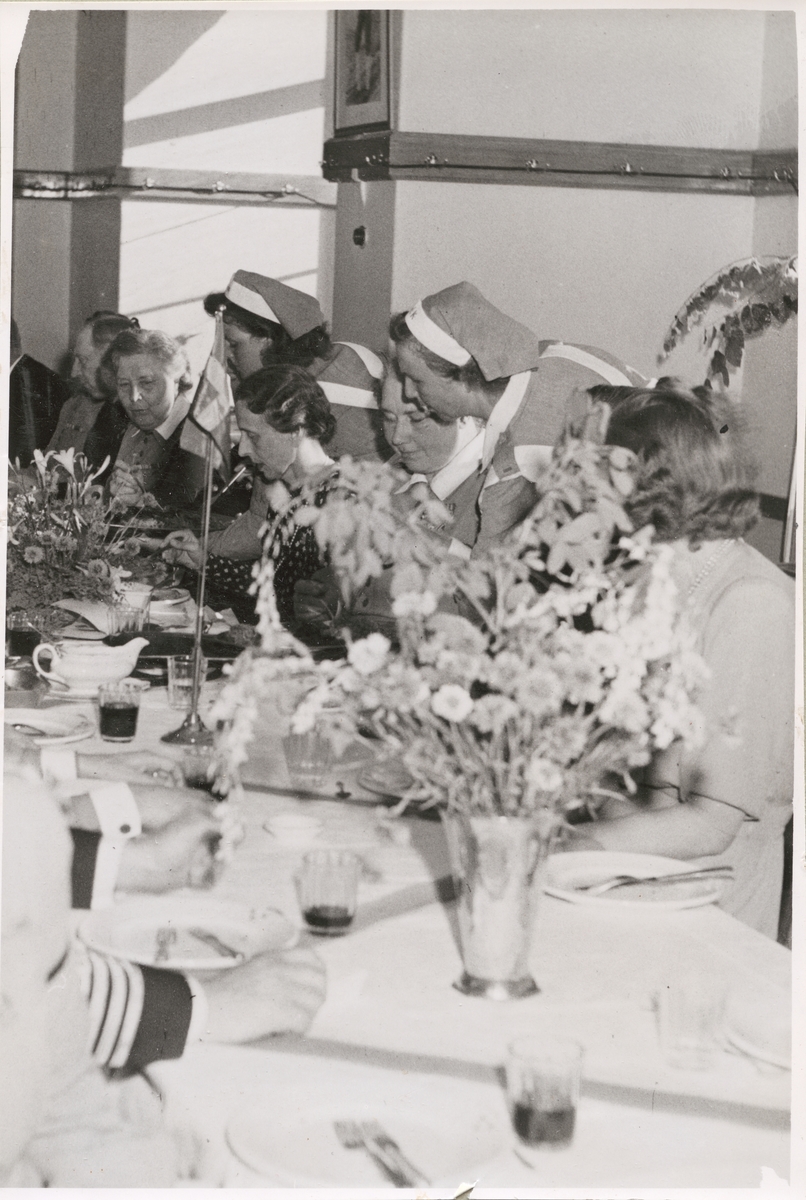 Drottning Louise sitter vid ett dukat långbord tillsammans med sjuklottor och militärer. På bordet står vaser med blommor, bestick och porslin samt en sverigeflagga.