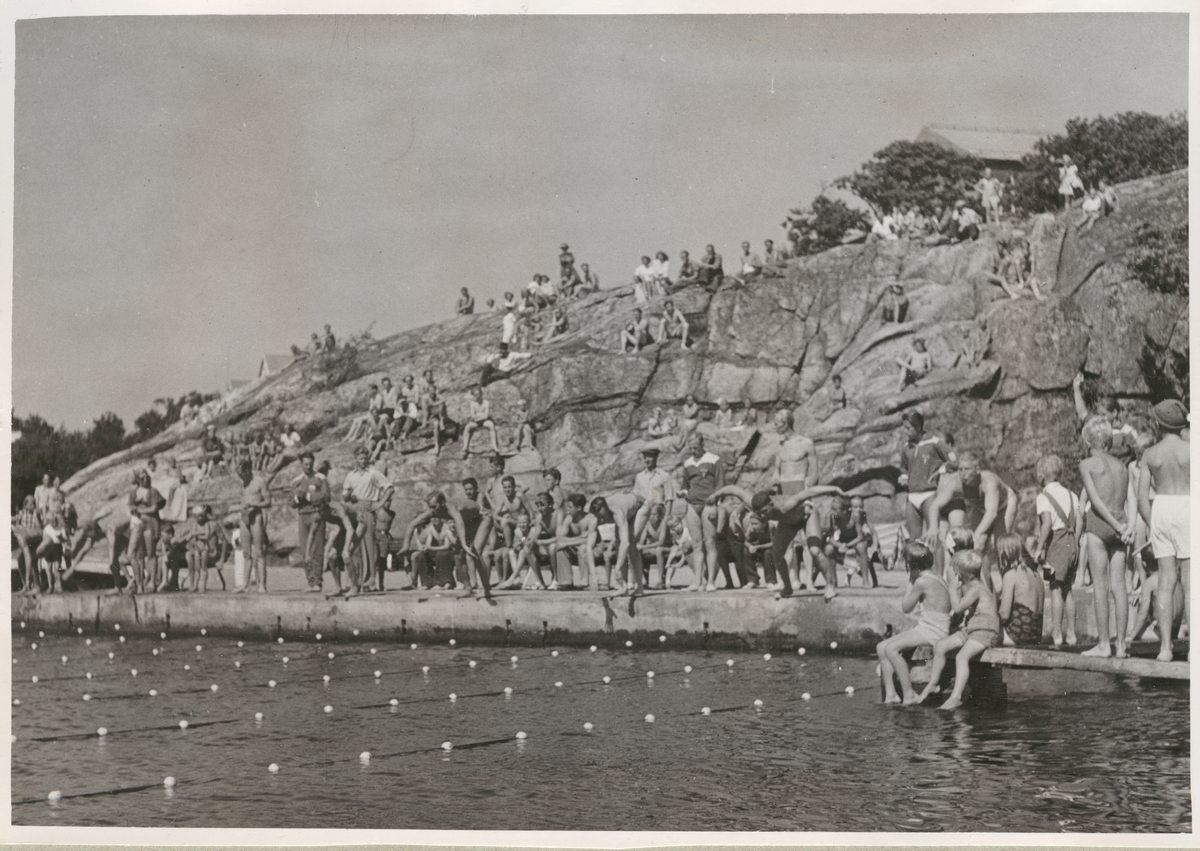Sju personer i färd med att dyka i vattnet i samband med en simtävling vid Saltö badvik. Runt omkring, samt på de omgivande klipporna, står och sitter flera åskådare i blandade åldrar. Flera personer är klädda i badkläder.