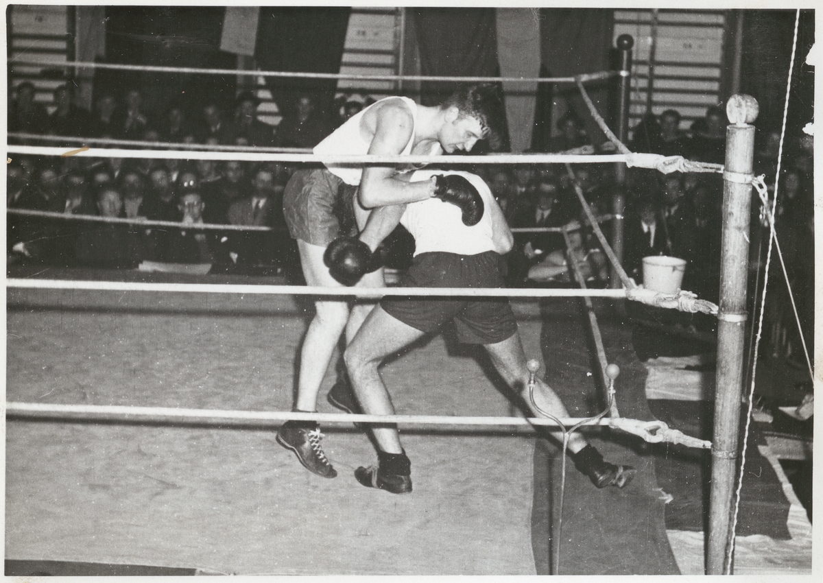 Två män klädda i idrottskläder och utrustade med boxhandskar står i en boxningsring och boxas. I bakgrunden, nedanför ringen, sitter en publik.
