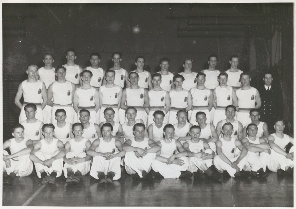 Gruppbild på gymnaster klädda i ljusa idrottskläder. De två främre raderna sitter ned på golvet medan de två övre rederna står upp. Längst till höger i den näst översta raden står en uniformsklädd militär.