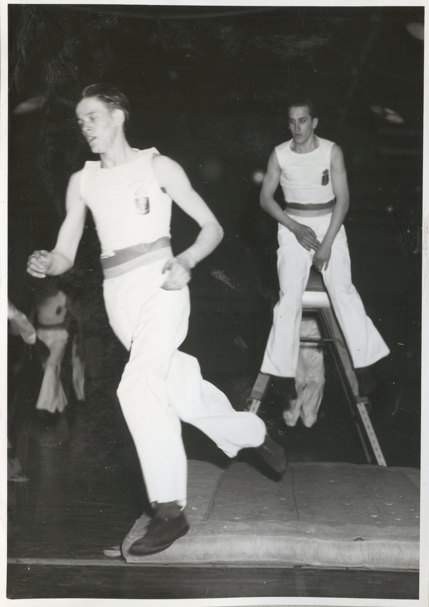Titel: Två gymnaster klädda i ljusa idrottskläder. Den ena springer medan den andra hoppar bock.
