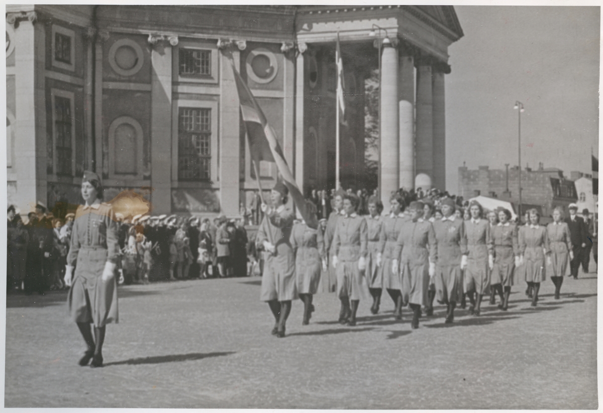 Marscherande lottor på stortorget. Näst längst fram i ledet går en lotta hållandes en stor Sverigeflagga. I bakgrunden syns åskådare från marinen såväl som civila stå framför Trefaldighetskyrkan.