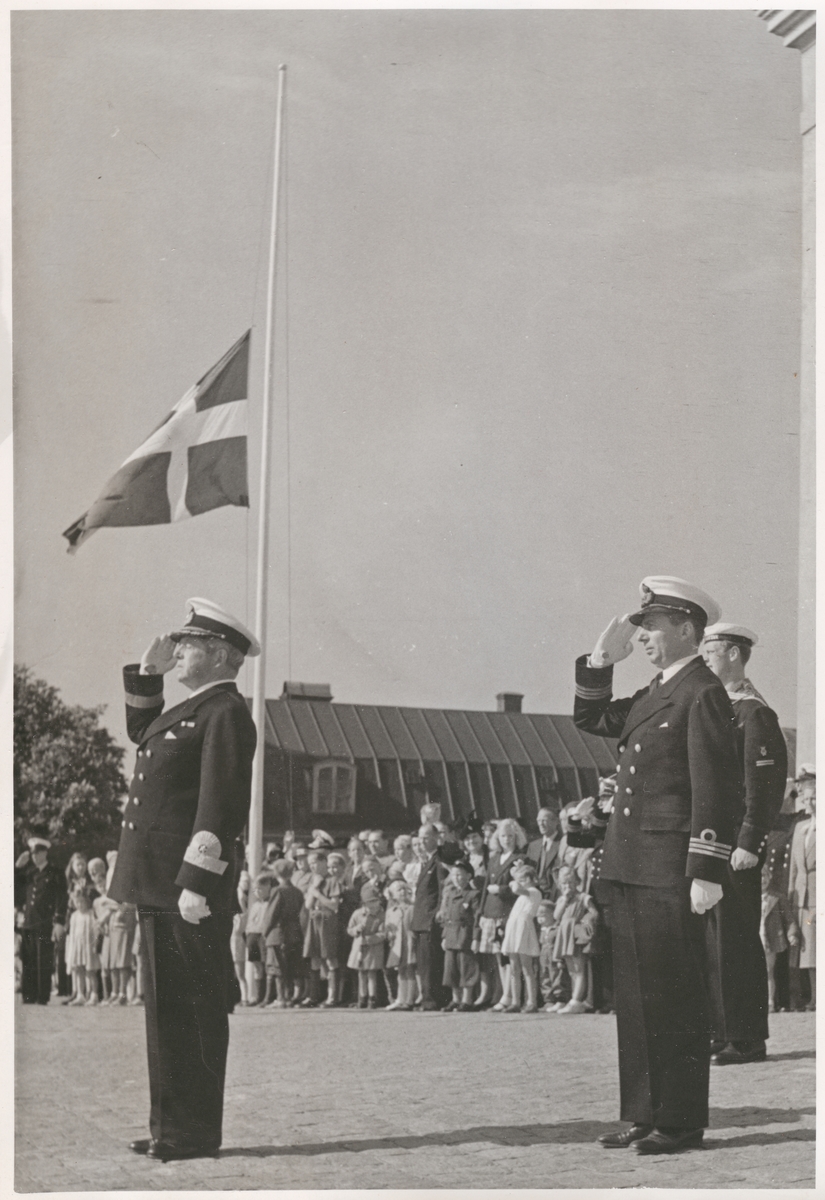 Konteramiral Gösta Ehrensvärd gör honör tillsammans med en kapten och en flottist medan en svensk flagga hissas. Alla tre är klädda i uniform och mössa. I bakgrunden syns ett plåtlagt tak och en folksamling bestående av barn och vuxna.