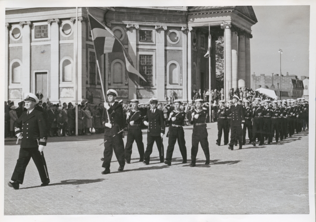 Flottister på marsch genom stortorget. Framför dem går en kapten följd av en fänrik som håller upp en Svensk flagga. I bakgrunden syns civila åskådare uppradade framför Trefaldighetskyrkan.