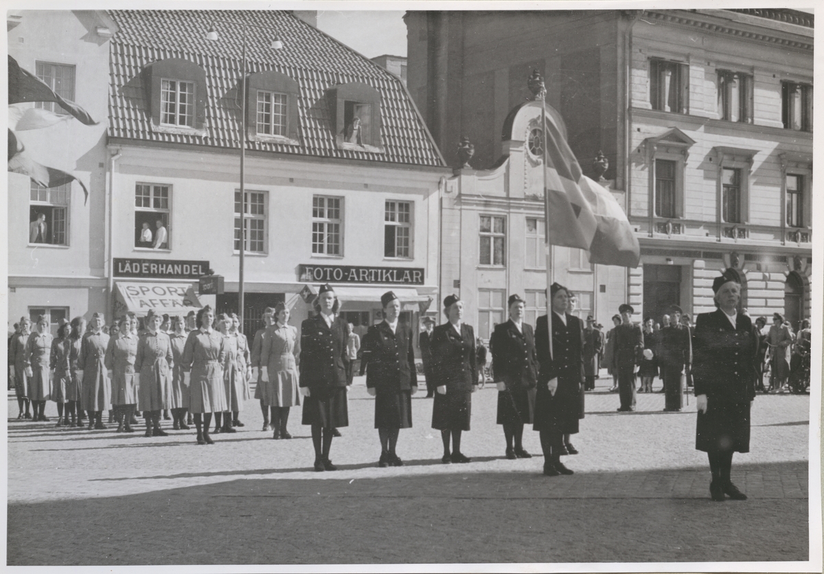 Lottor i uniform står uppställda på stortorget i Karlskrona. I bakgrunden skymtar åskådare på marken samt sittandes i fönster i bakomliggande byggnader. I bakgrunden till höger skymtar Karlskrona Stadshotell.