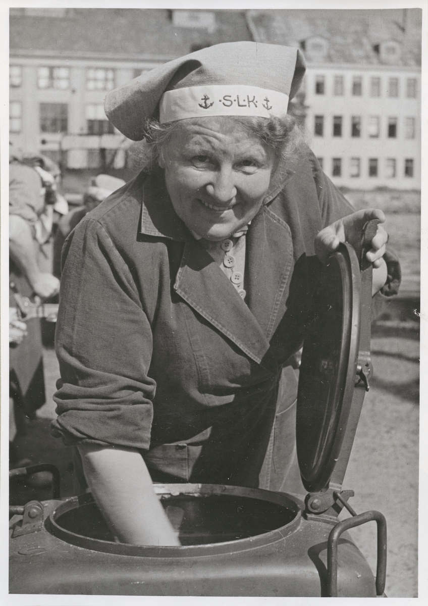En lotta i arbetskläder och hätta med broderad text "S.L.K" står med handen i ett kokkärl på en matlagningsstation.