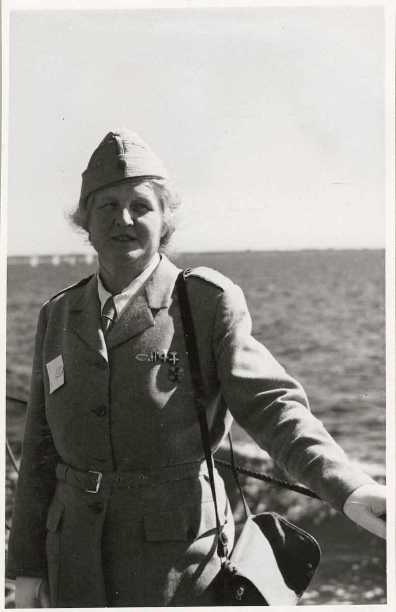 En kvinna från lottakåren, klädd i uniform, poserar för ett fotografi. I bakgrunden syns havet.