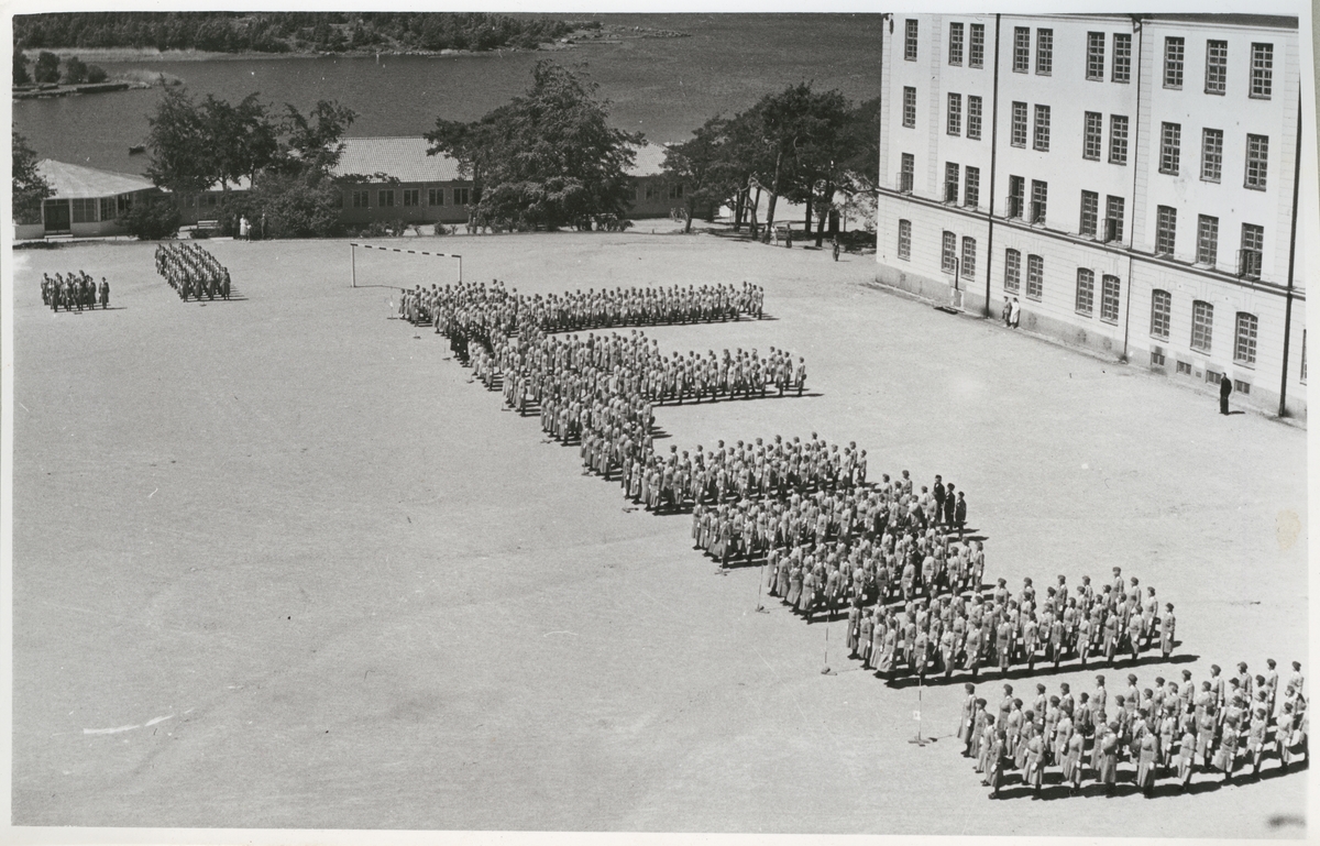Uniformsklädda lottor står uppställda på Gräsviks övningsfält. Övningsfältet avgränsas i norr av den norra kasernen och i väst av rotundan.